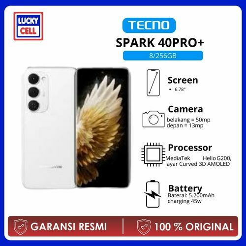 Tecno Spark 40 Pro+ hadir dengan Android[?]15 (HiOS[?]15), prosesor MediaTek Helio[?]G200, layar Curved 3D AMOLED 6,78[?] 1,5K 144[?]Hz dengan Gorilla[?]Glass[?]7i, dimensi tipis 163,9[?]x[?]75,8[?]x[?]6,49[?]mm, RAM 8[?]GB (ekspansi virtual 16[?]GB) dan storage hingga 256[?]GB, kamera belakang 50[?]MP (EIS), depan 13[?]MP (dual[?]flash), baterai 5200[?]mAh dengan 45[?]W fast charge, 30[?]W wireless dan reverse, sertifikasi IP64 dan ketahanan jatuh hingga 2[?]m, konektivitas lengkap termasuk NFC, Wi[?]Fi 6, infrared, serta fitur unggulan seperti FreeLink, dual speaker Dolby Atmos, dan rangkaian AI productivity tools.